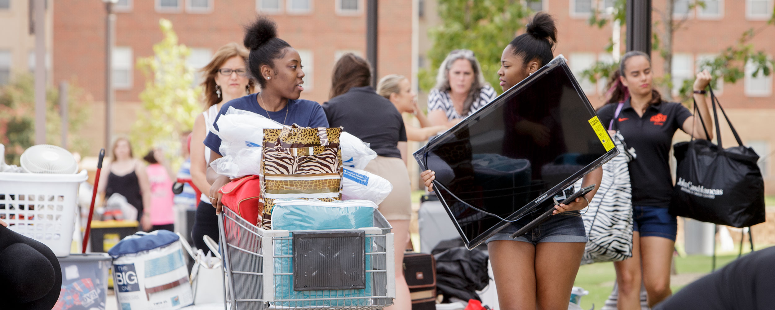 Girls pushing cars full of belongings